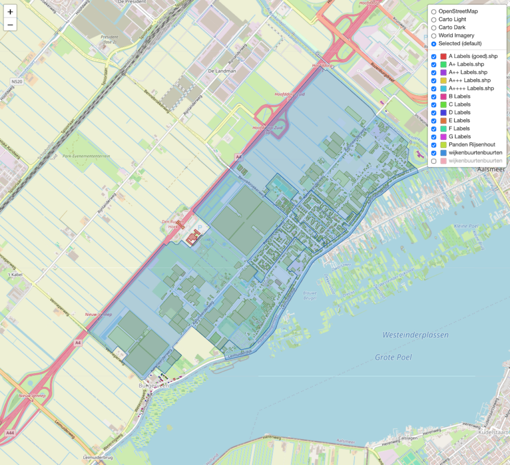 Energie en andere inzichten over Rijsenhout, klik rechts op de labels (aan/uit) om de lagen zichtbaar te maken. Maurice heeft uit allerlei openbare bronnen verschillende lagen gemaakt die je over de kaart van Rijsenhout kunt leggen, en aan/uit kunt zetten. Zoom in op de kaart zodat je Rijsenhout ziet, en speel met de blauwe vinkjes.