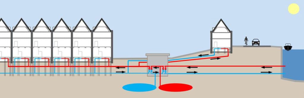 Maar wat ons ook duidelijk werd: er zijn heel veel verschillende manieren om het systeem vorm te geven, want aquathermie is er in vele vormen. Zo kun je water op een centraal punt verwarmen naar 50 of naar 70 graden en met die temperatuur naar de woningen transporteren. Bij elk huis zorgt een kleine pomp er dan voor dat het door de vloerverwarming of door de radiatoren wordt gepompt. Je kunt ook het water met een temperatuur van 12-16 graden naar de huizen brengen en het daar met een individuele warmtepomp opwarmen naar 50 of 70 graden. Bovendien moet een warmtenet worden aangelegd met buizen die warm of koud water naar huizen kunnen brengen.